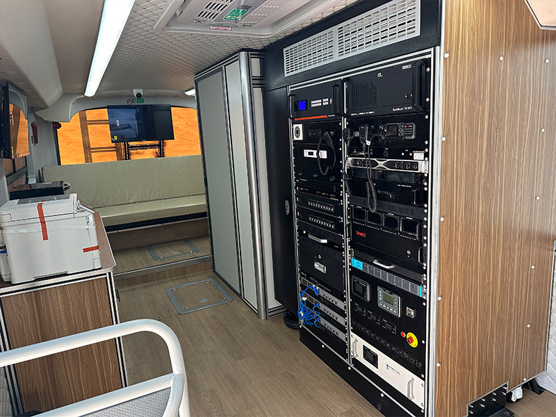 另外还配备了供配电系统、升降照明系统、激光打印一体机、车载饮水机、微波炉等生活设备,可以满足长时间野外作业。
