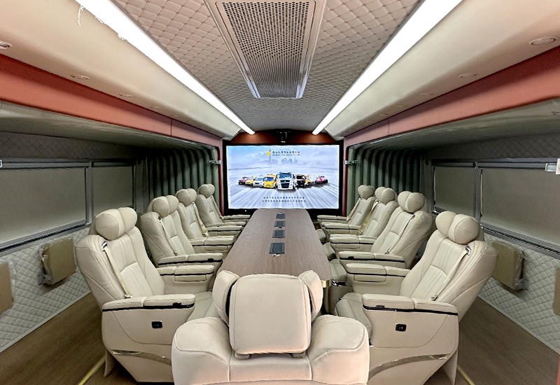 采用双侧拉厢式舱体,内设多功能会议桌、9把高端定制会议椅、10把折叠座椅,空间宽敞,可满足19人同时会议功能。