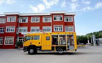 汕德卡双排座消防专用底盘/ 指挥办公系统/ 车辆照明系统/ 液压尾板 (选装)/ 车载抽拉式淋浴系统/ 通信系统/ 应急救援装备/ 液压抢险装备/ 生命保障系统/ 抢险人员自助救护系统/ 供配电系统/ 警灯警示系统