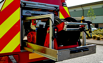 厢体两侧采用消防卷帘门或上掀门,后部为对开门或上掀门结构,取放设备快捷、方便。