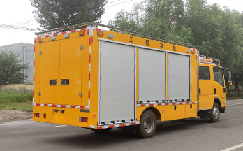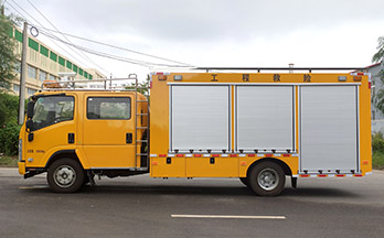 选装配置:选装行李架、爬梯、车顶工作台;选装不同形状、结构的警示灯;选装中隔断(可选择开门)、车身两侧可选开上掀门、盲窗、侧开门;花纹铝板;加装设备工具柜、配电箱、发电机组、水泵、电焊机、空压机等线路安装外接电源系统、(室内灯光照明、探照灯、高杆照明灯等);绕线盘,还可根据用户不同需求加装不同的维修抢险设备、车身制作专用图案或标识。