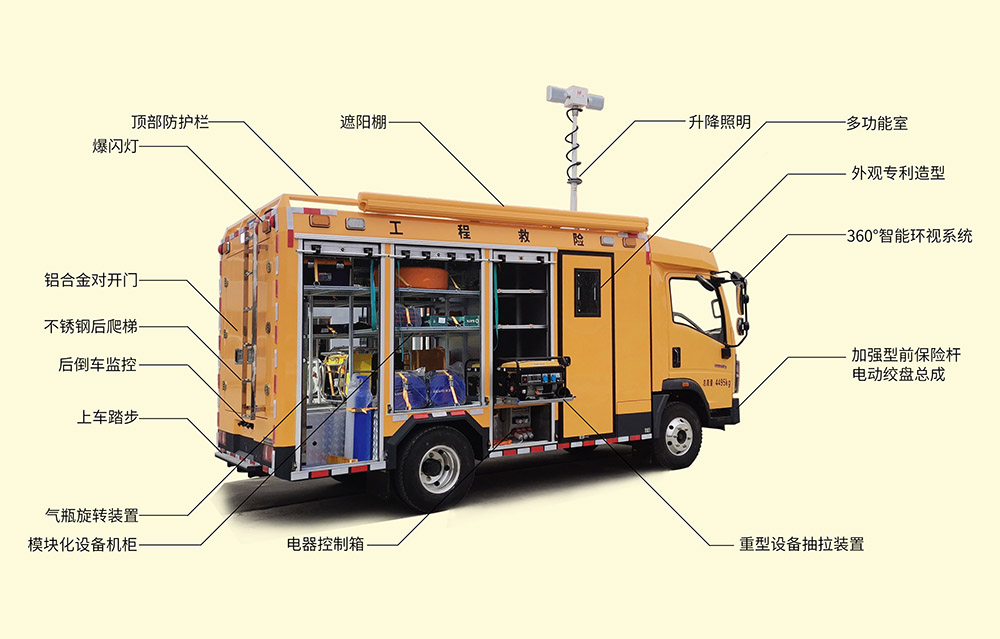 九瑞多功能应急抢险救援车由重汽底盘改装而成,单排宽体驾驶室,高强度上装车身,铝合金骨架对开门和消防专用大卷帘门设计。专为城市排水量身打造的一款专用救援及装备车辆。