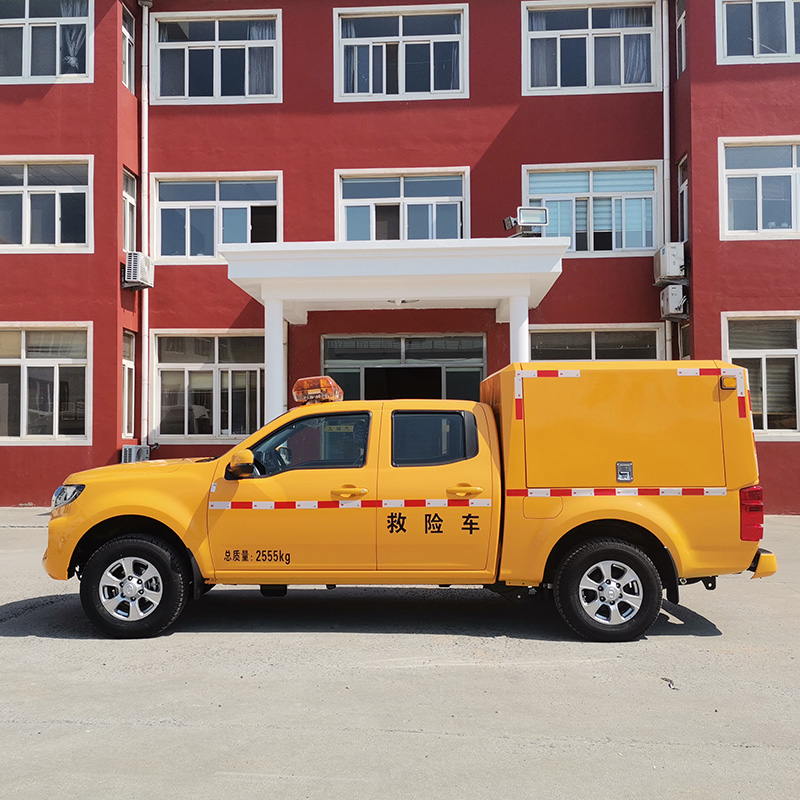 皮卡救险车的后厢体全部采用轻质、防腐效果好的铝合金焊接而成,左右侧为上掀门结构,后部为上掀门和下翻门结构,地板则铺设花纹铝板。这种设计使得车辆具备了良好的耐用性和防腐性能,能够在恶劣的环境下稳定运行。