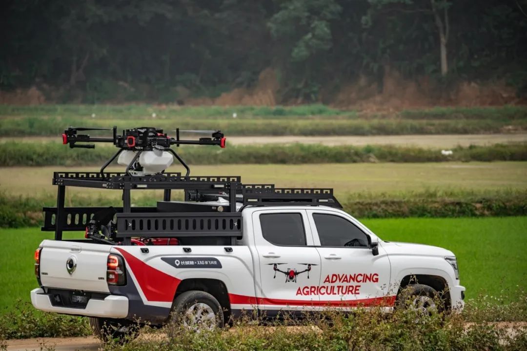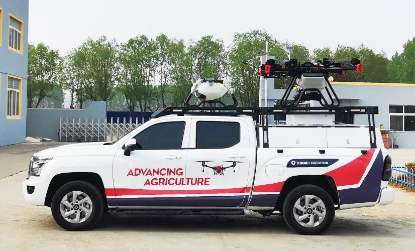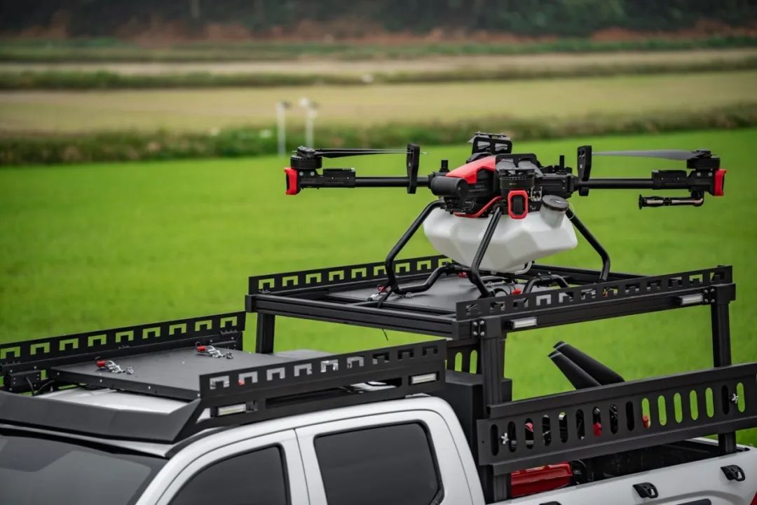 金刚炮新农人版一次性提供完整的模块化箱体、以及车顶无人机平台,可以同时装载两架植保无人机,单日能完成近千亩农田的植保作业。无人机载物架整体采用钢材结构,坚固耐用,承载力更强。