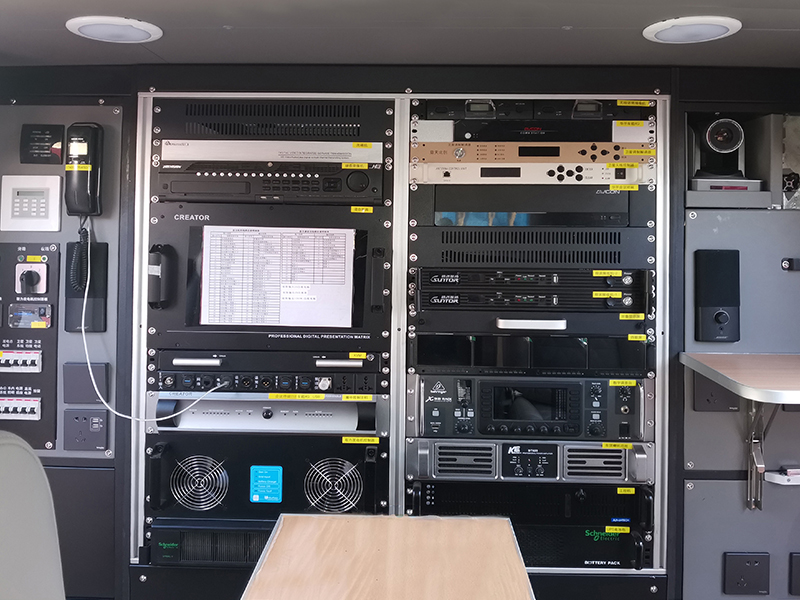 车内平台按功能分为三段,前部驾驶舱、中部操作舱、后部设备舱;操作舱设有两个可旋转座椅,方便进行通信设备操作;后部设备舱可配备电缆盘、发电机控制单元、UPS主机、蓄电池、杂物柜,设备配重布局合理,安装平衡稳固。