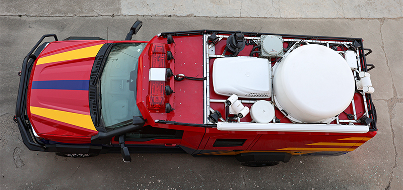 整车外观霸气,一体式造型,模块化钢制保险杠,抗冲击力极强;车身采用钢骨架、铝蒙皮结构,稳固安全。车顶定制行李架,前保险杠内置12000磅拖车钩。驾驶室顶部装配红色警灯及5灯头探照灯,LED主灯组与围绕轮廓的LED日间行车灯,警示效果强。