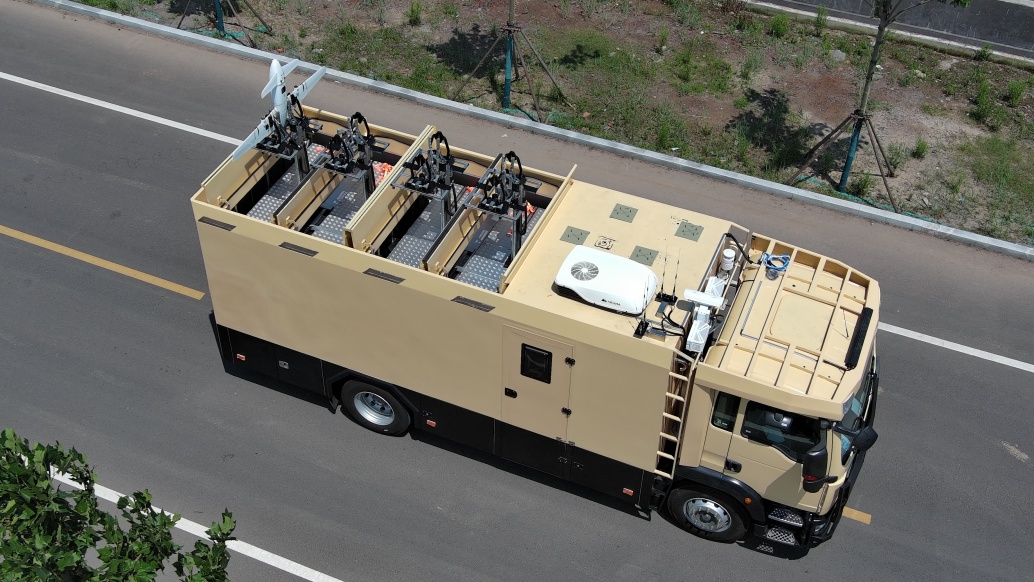 可用于搭载和调度多架无人机的重型卡车平台。具备强大的承载和运输能力、多无人机联合作业支持、以及多联指挥调度功能。