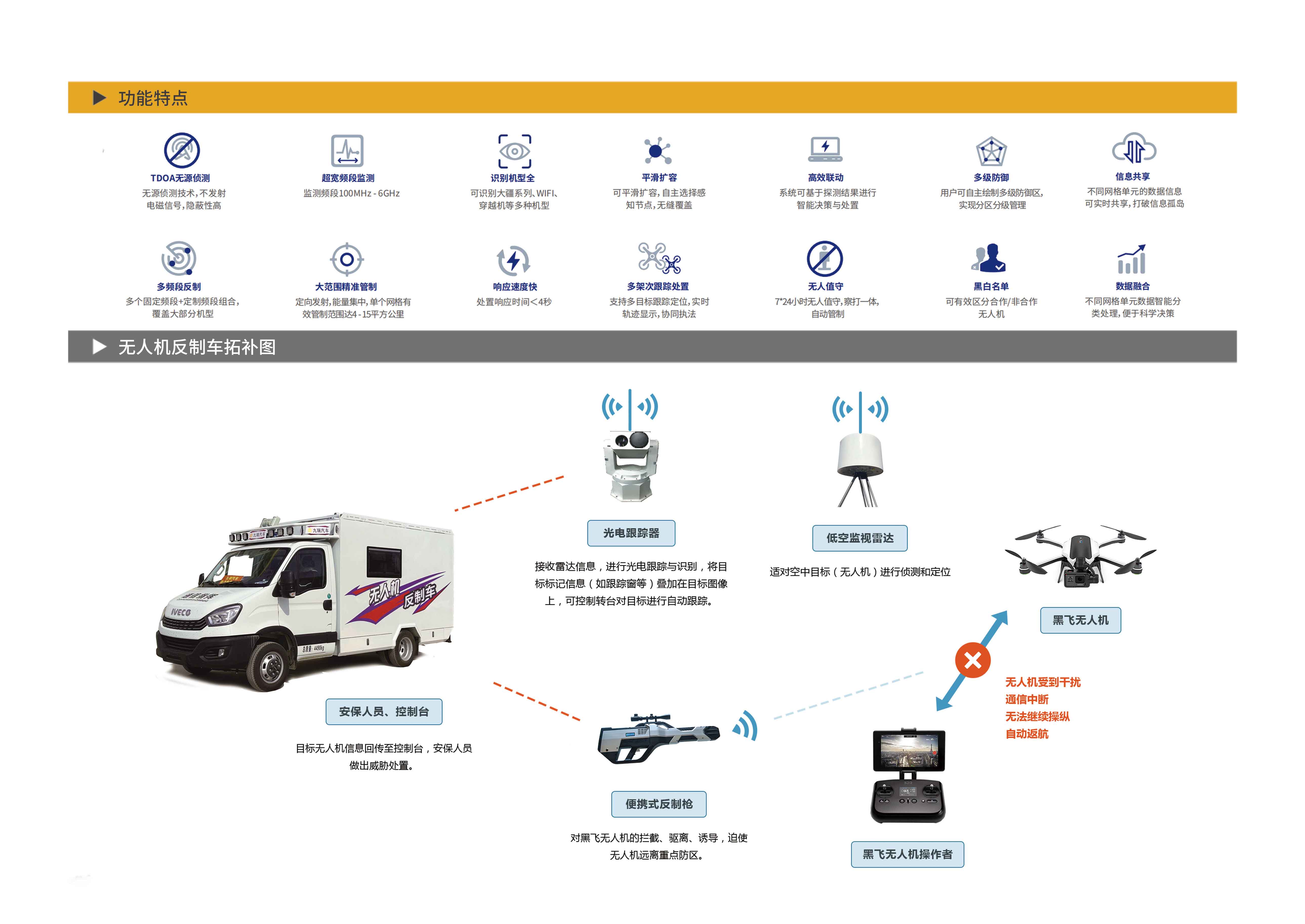 反制相关设备:搭配特金低空安全管理平台。低空安全管理平台是面向城市级大面积空域低空安全管理需求而开发设计的智能化软件平台,它深度融合了人工智能、大数据等前沿技术,构筑起“探测、预警、个体识别、实时定位、轨迹追踪、精准处置、数据分析”六位一体的端到端低空安全管理能力。该平台 采用开放式架构,具备强大的多源设备接入能力,可接入频谱、5G-A、光电、雷达、无线电压制、导航诱骗等各类固定式低空安全管控设备,以及手持式、车载式设备,形成立体化空地一体监测网络,有效满足合作与非合作目标的安全管理需求,为城市低空提供全方位安全管控能力。