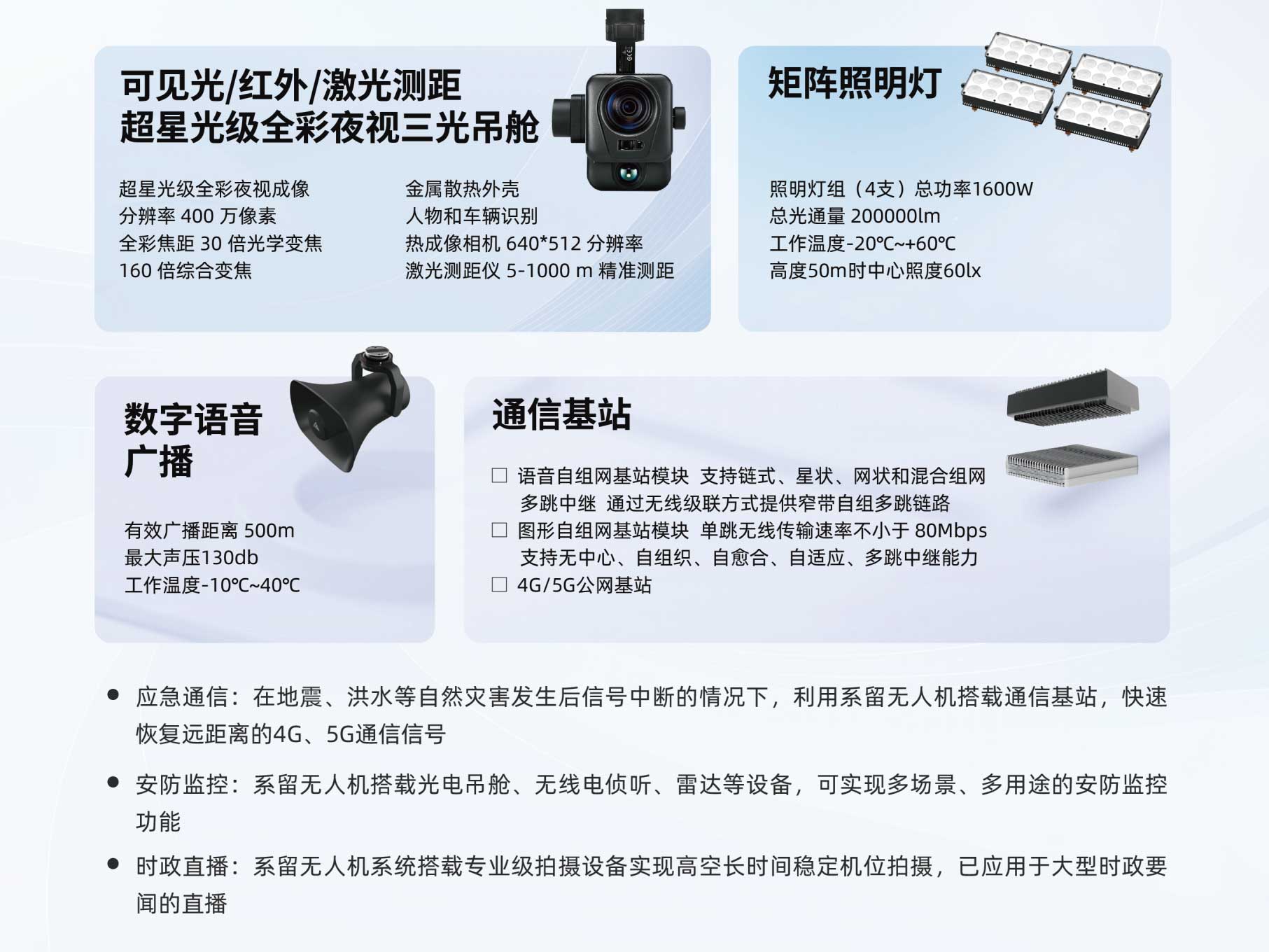 系留无人机:24H超长不间断滞空、抗风6级、抗电磁干扰、10KW超低功耗、工作海拔4500米、多冗余度飞控系统确保飞行安全;