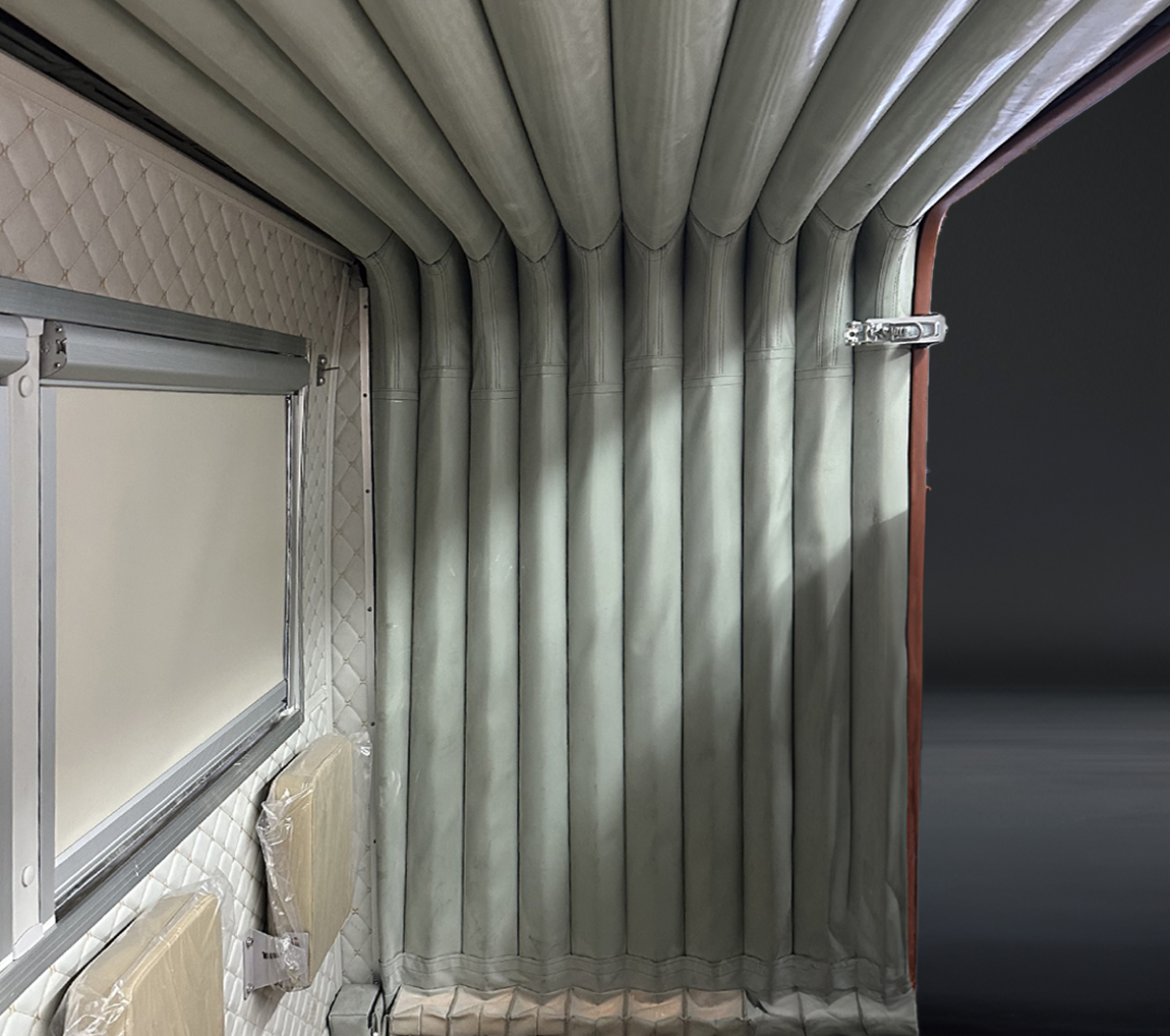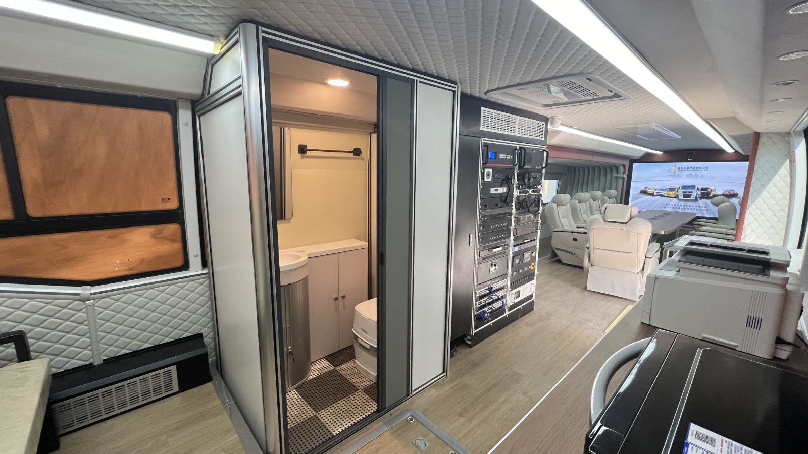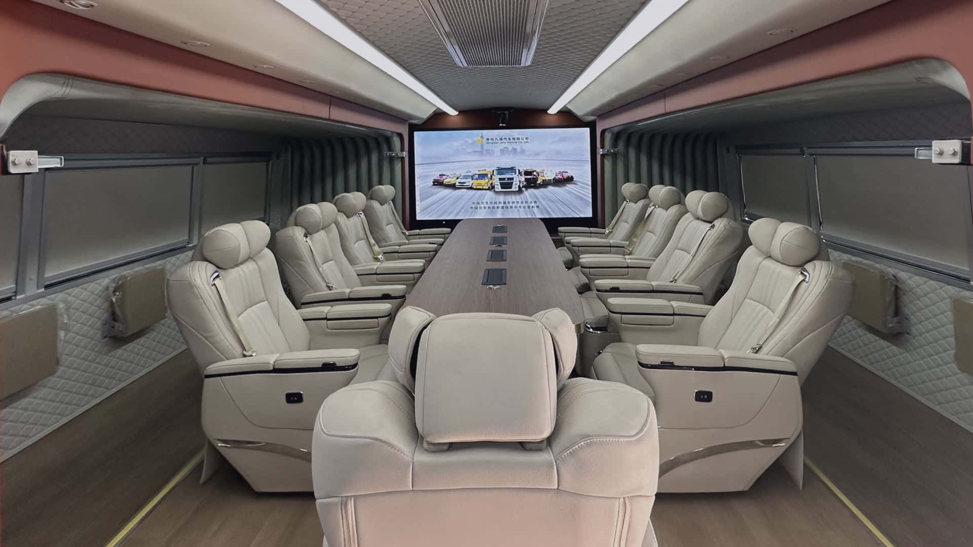 采用双侧拉厢式舱体,内设多功能会议桌、9把高端定制会议椅、10把折叠座椅,空间宽敞,可满足19人同时会议功能。