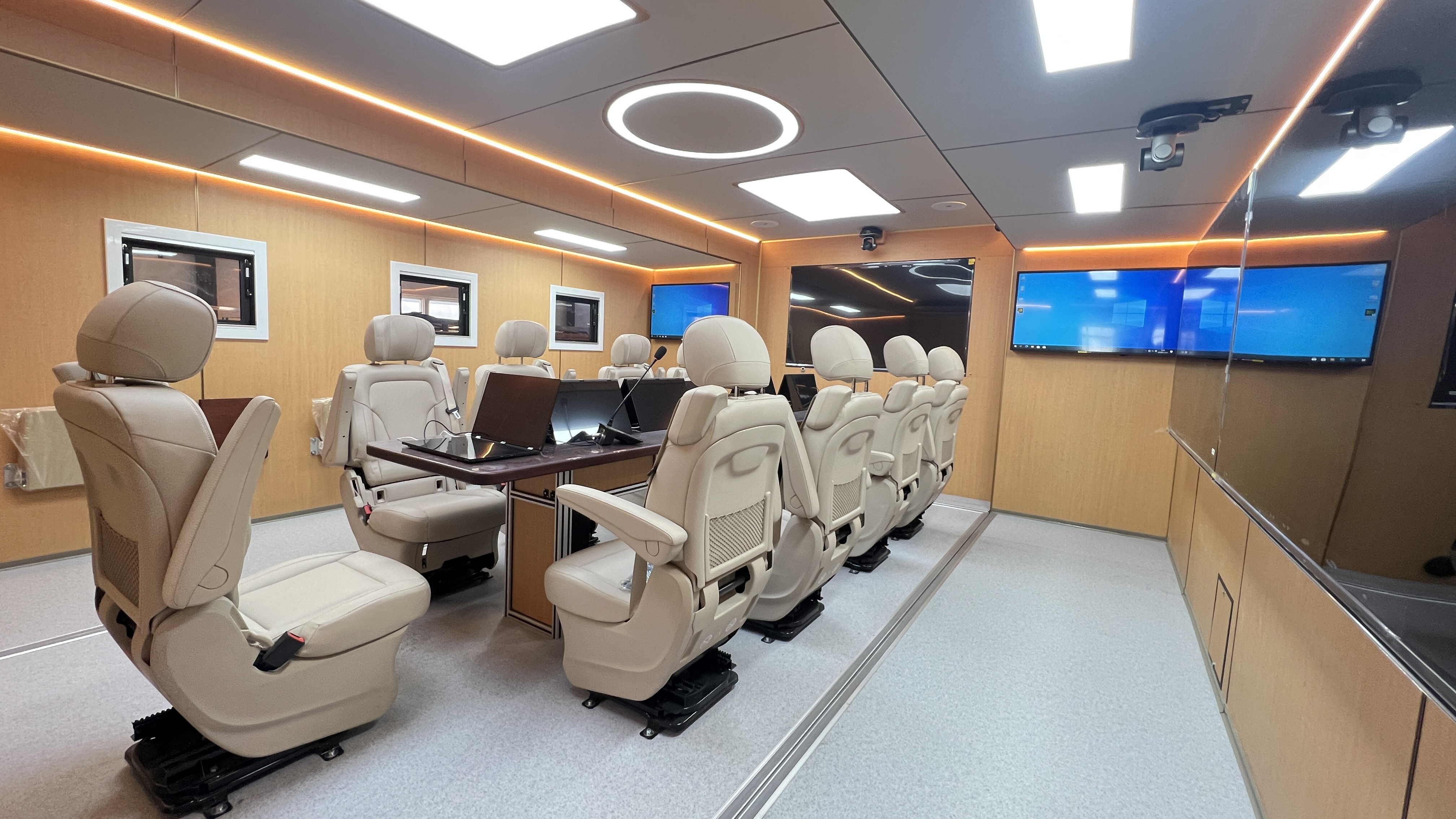 通信指挥车由驾驶间、会议间、操作间和发电机间四个相对独立的功能区间构成,会议间为双侧拉结构,最大工作面积可达20多平方米,能同时容纳21人参加会议。