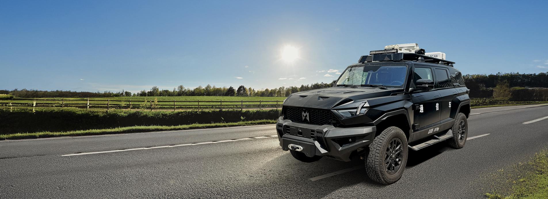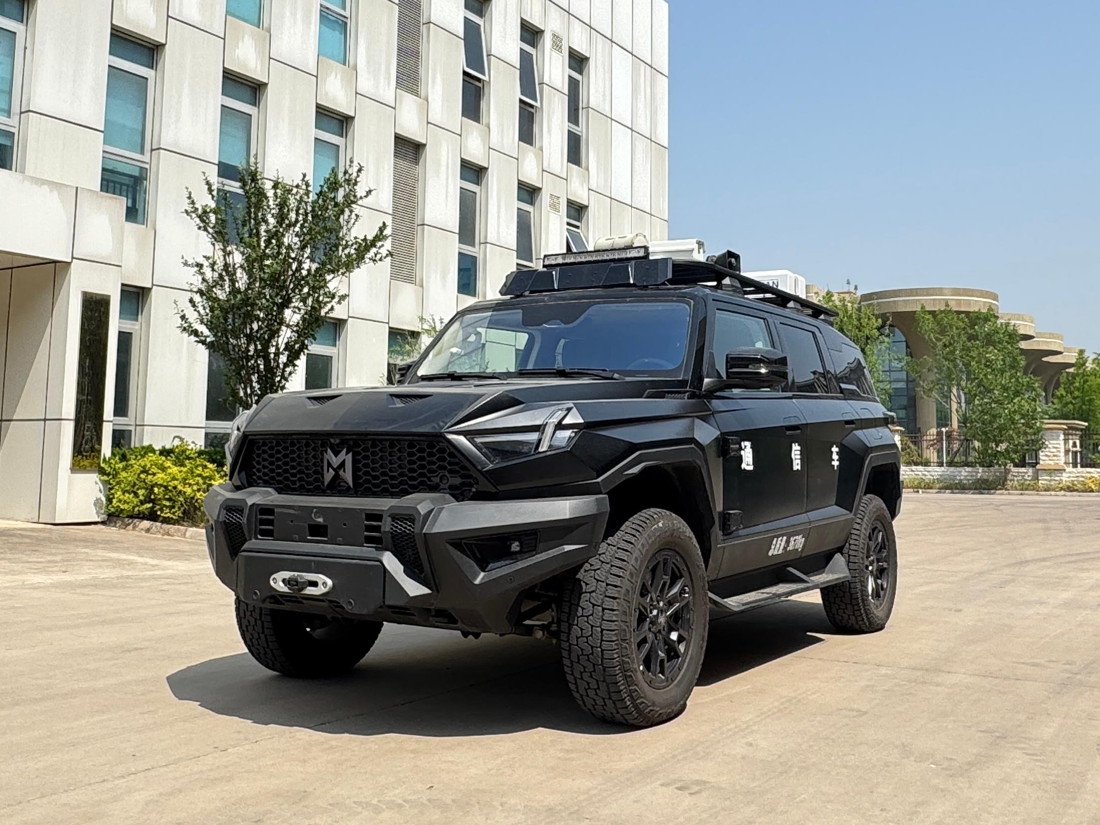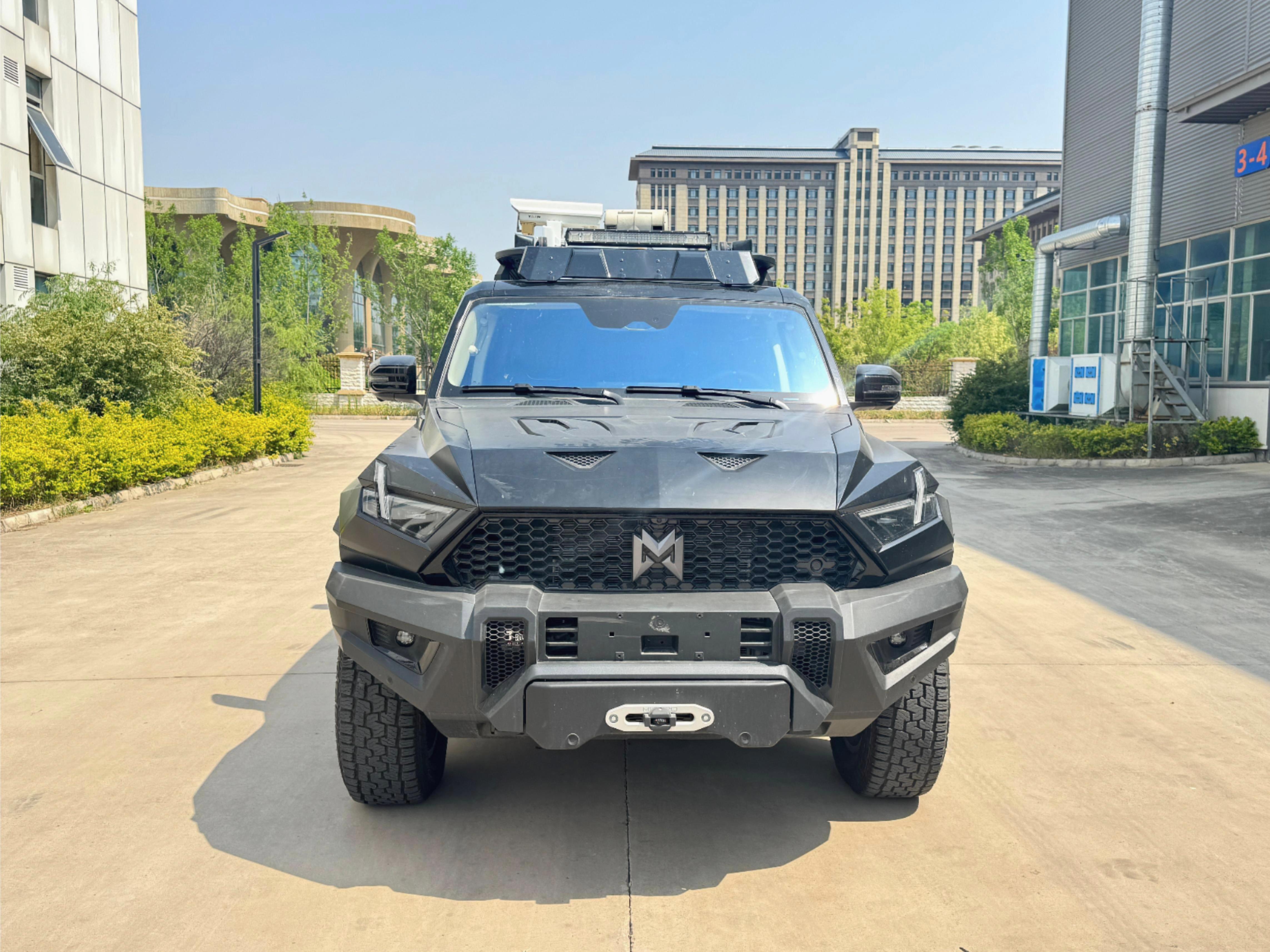 动力系统采用增程式混合动力,能输出最大816匹马力和1050N·m的最大扭矩,续航里程可达600km,可满足长距离、高强度任务需求。车辆整备质量3500kg,尺寸为长5096mm、宽2080mm、高2314mm,轴距2950mm。此外,车辆满足公安B级防爆标准,配备防爆涂层、TPE玻璃防爆膜和防爆胎等,安全性高。